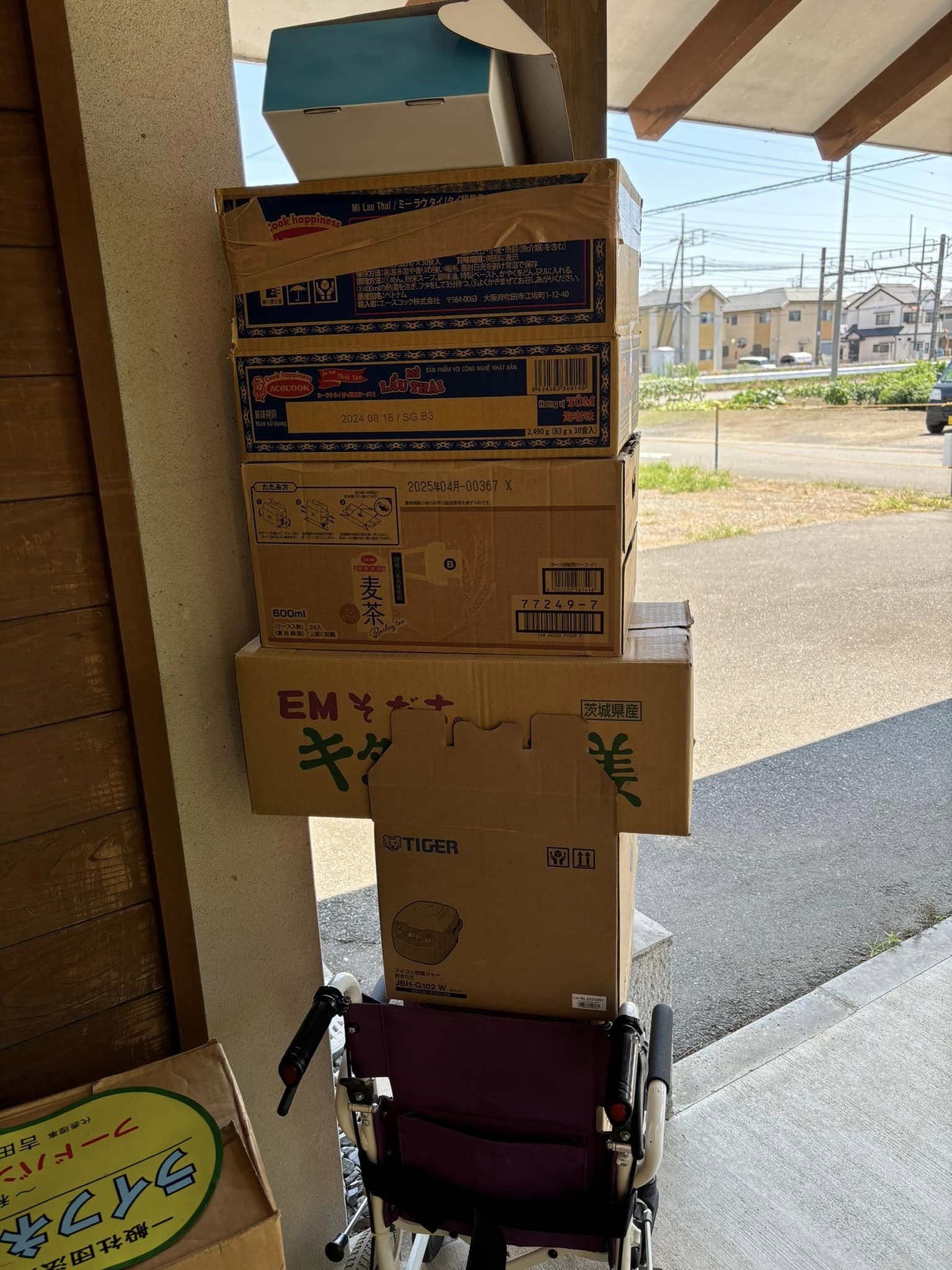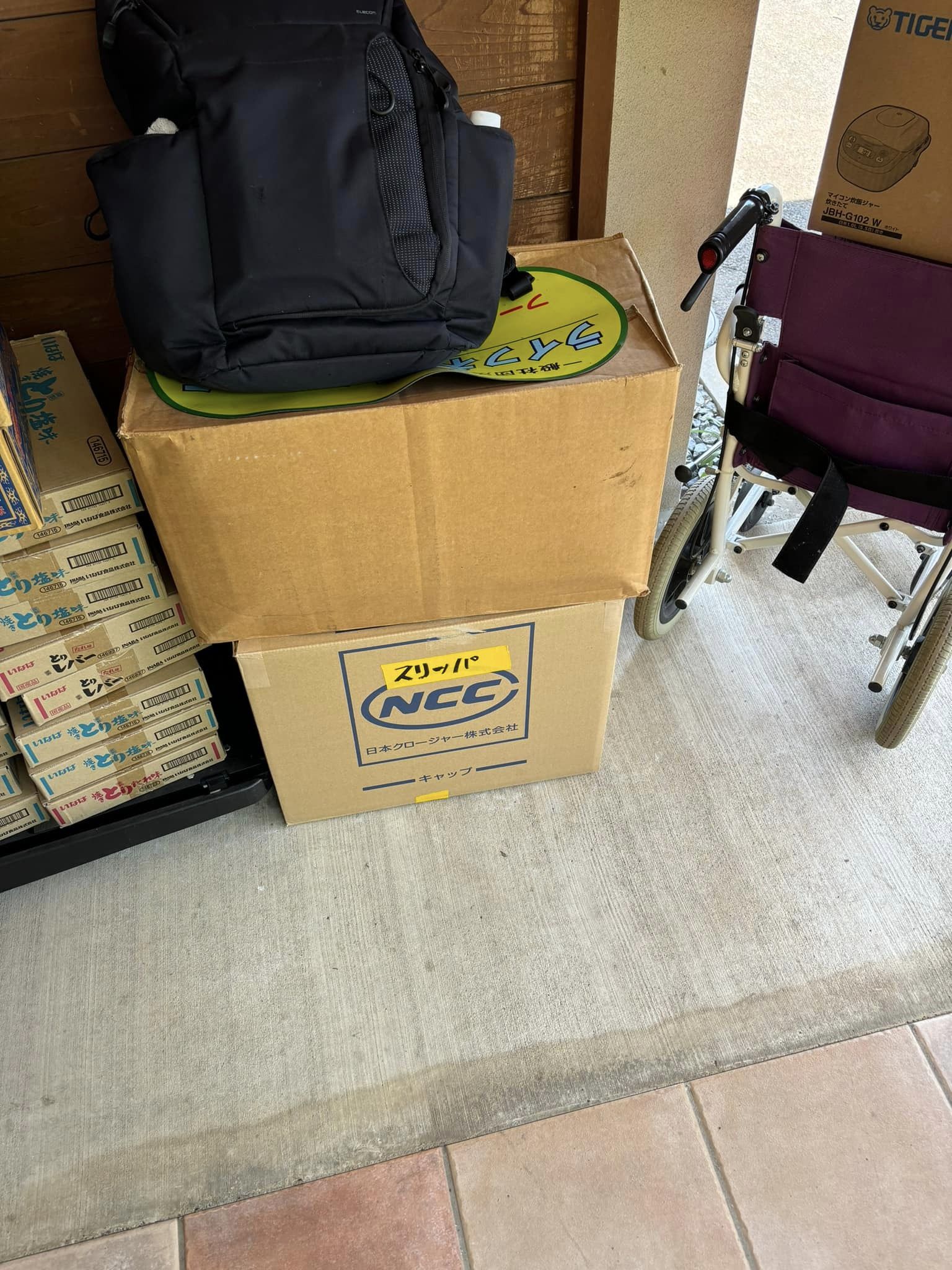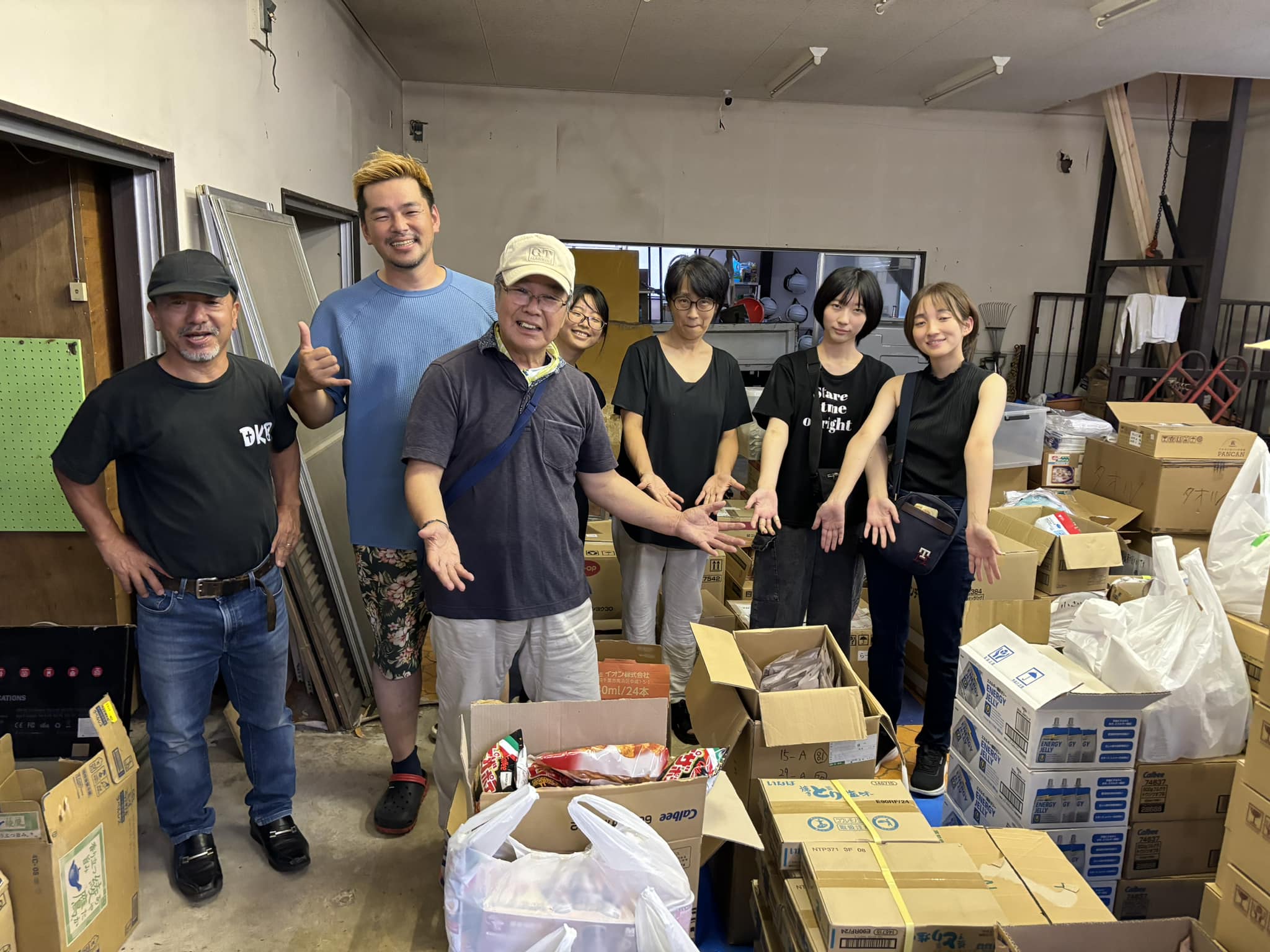 ラーメン120食、精米品(無洗米)20キロ、パックご飯、ソバ、ソーメン、冷やし中華麺、煎餅、羊羹、かりんとう等。スリッパ200セット。夕方届けます。