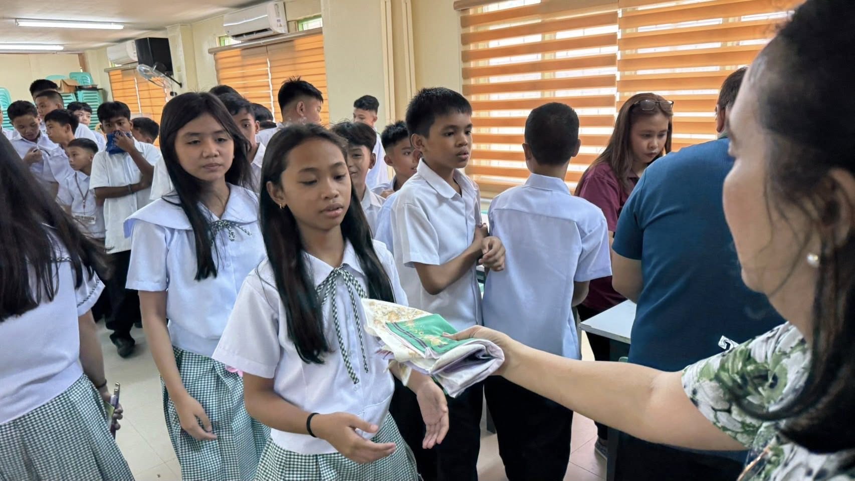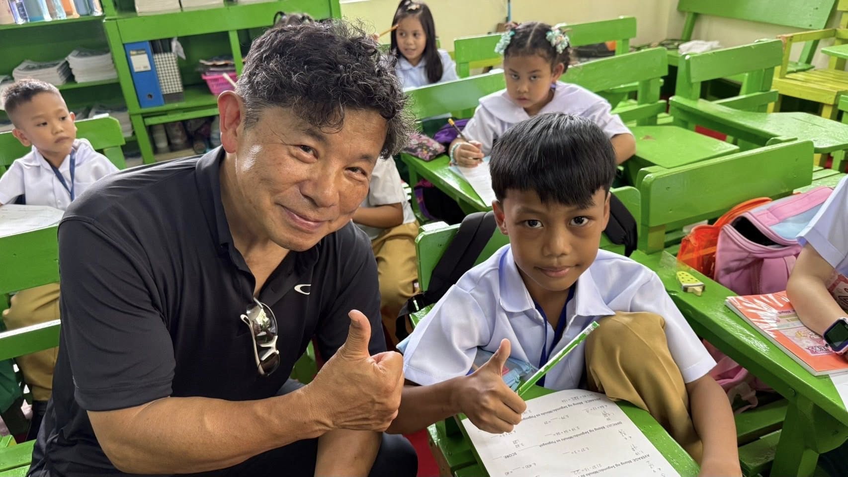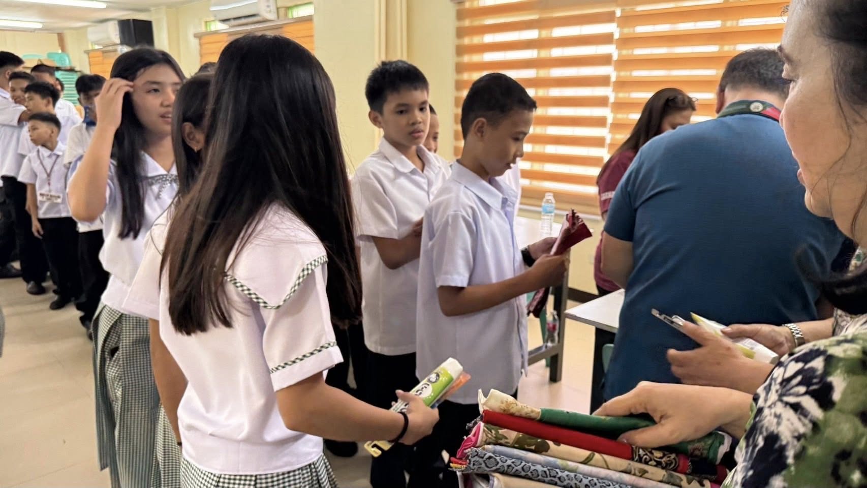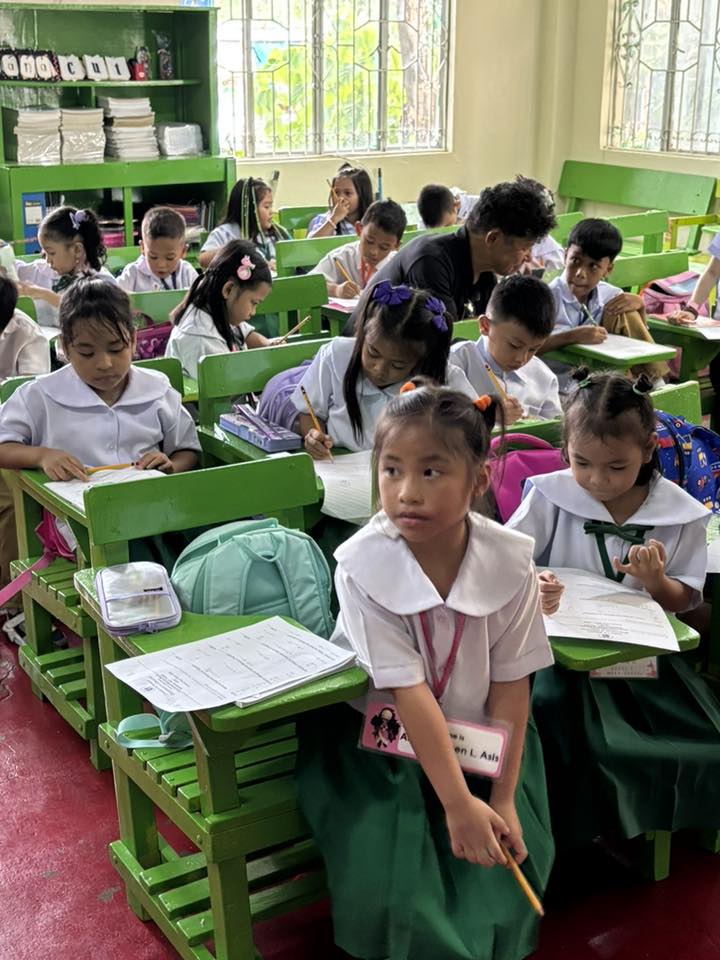 ③夏休みが終わって新学期が始まった、ラスピニャス小学校を訪問しました。2年生が算数のテスト中でした。先生達とも交流して、学習用品が不足していることを知りました。