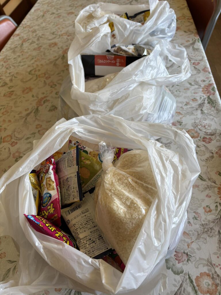 ひとり親支援子ども食堂経由で、ひとり親にプレゼントする食品を3軒分用意しました。今回は特別に米を加えました。この他、野菜がプラスされます。支援者の皆様ありがとうございます。