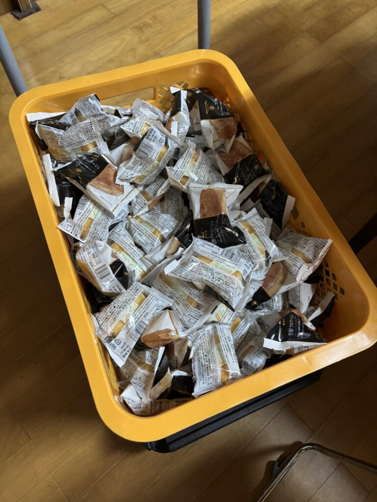 フードバンク支援者がお菓子540個を届けてくれた。給食がない夏休みの為、ひとり親家庭や低所得者家庭の子どもたちはひもじい思いをしています。早速子ども食堂や地域食堂に配布します。
