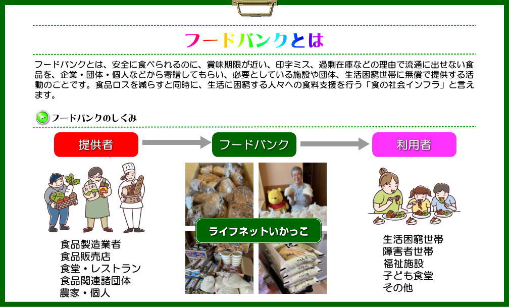 フードバンクとは、包装の破損や印字ミス、規格外品などの理由で流通に出すことができない食品、在庫過剰となった食品、今後消費する見込みのない食品、防災備蓄用で交換時期をむかえる食品など、こうした理由から、品質そのものには全く問題がないものの食べられないままにこれまで廃棄されてきた食品を家庭や企業などから寄贈していただき、支援を必要としている施設や団体、困窮世帯に無償で提供する活動や、その活動を行う団体をいいます。この活動は寄贈を受けた食品を一時的に保管する場所を確保しこれを管理する必要があり、主に非営利活動法人(NPO法人)により行われています。